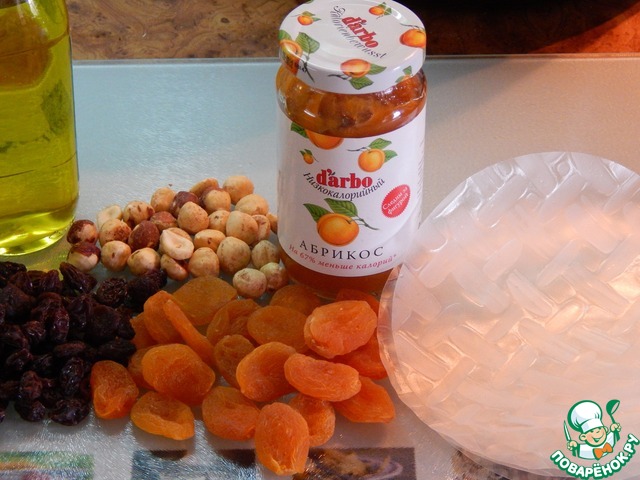 Добавляем измельченную курагу, изюм, конфитюр. Все перемешиваем.
