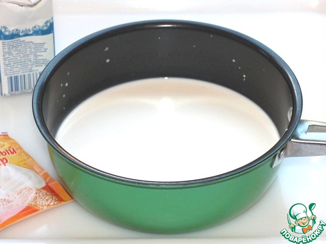 Сливки наливаем в кастрюлю, кладём сахар (100 г) и ванильный сахар. Затем добавляем разбухший желатин. Ставим кастрюлю на плиту и нагреваем до растворения желатина, не доводя до кипения.