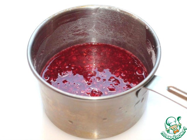 Малину с сахаром кладём в кастрюлю и ставим на плиту. Немного нагреваем и добавляем крахмал. Варим минут 5 до загустения, постоянно помешивая. Соус "Бланманже из малины" готов!