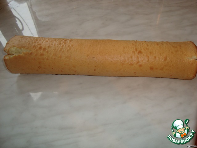 Сворачиваем бисквитное тесто в рулет. Если по краям образуются трещинки, не пугайтесь.