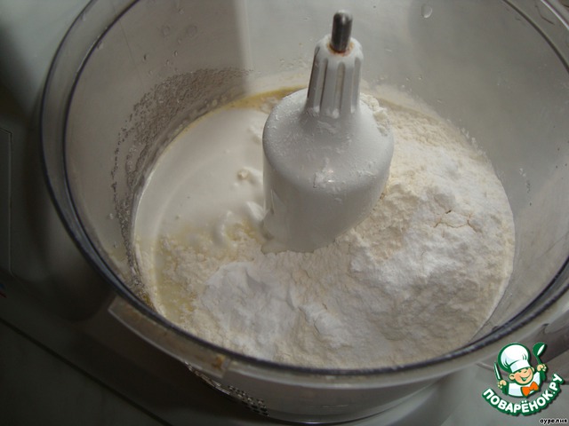 1/3 часть взбитых белков соединить с желтками, добавить муку и перемешать.