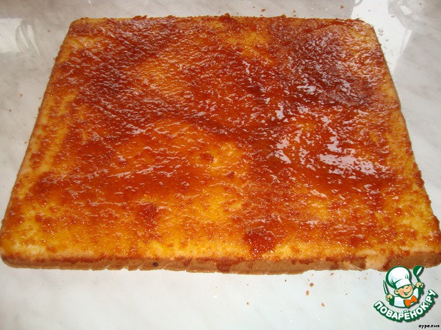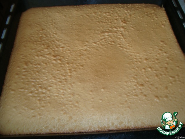 Остывший бисквит увлажнить сиропом. В такой сироп можно добавлять разного вкуса эссенции 2-3 капли (если кому хочется).