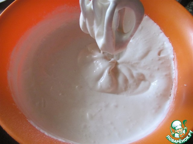 Возвращаемся к нашим нагретым белкам. Взбиваем миксером сначала на средней скорости. Затем добавляем по 2 ст. л. сахарной пудры и взбиваем до устойчивых пиков. Затем по 2 ст. л. вводим муку.