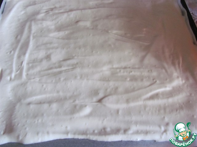 Выливаем наше тесто на пергаментную бумагу и отправляем в разогретую духовку. Выпекаем 15-20 мин. и остужаем 5 мин.