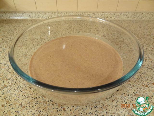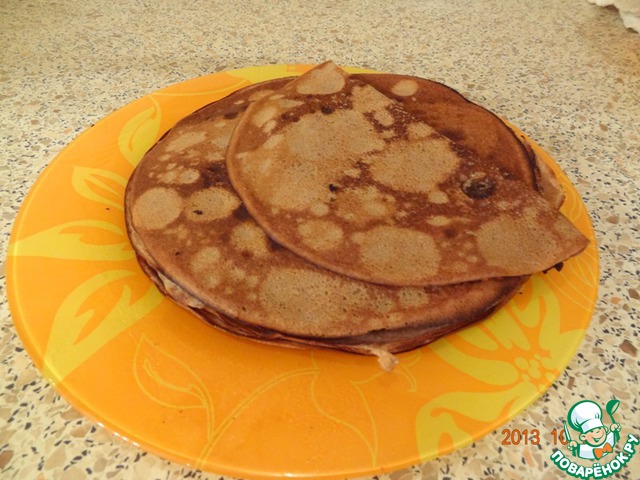 Приготовить тесто на блины: смешать яйца, муку, соль, сахар. Добавить подсолнечное масло, щепотку лимонной кислоты и какао-порошок. Сухое молоко развести в воде и влить в тесто, взбить миксером.