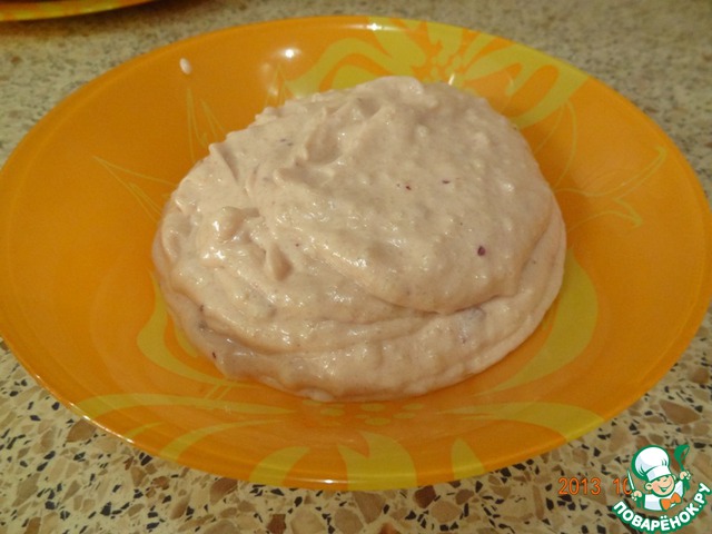 Приготовить крем: сварить на молоке манную кашу и остудить. Сливочное масло взбить с манной кашей, клюквенным соусом и сгущенным молоком. Остудить крем в морозилке.
