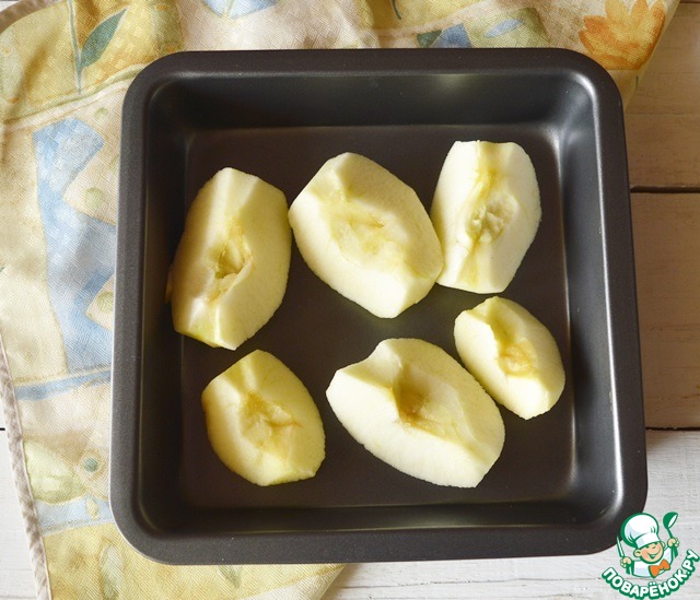 Возьмем яблоки (2 больших) и разрезаем их на половинки. Чистим и удаляем сердцевину. Затем делим еще на 2, получая четвертинки. Отправляем в духовку с температурой 160 градусов на 1 час.