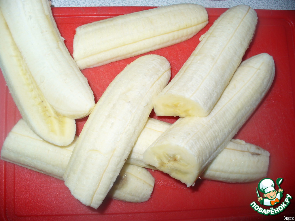Бананы очищаем от шкурки. Режем пополам поперек, а еще раз пополам, но уже вдоль. Если мини-бананы, то режем сразу пополам вдоль.