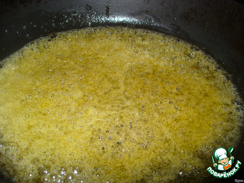 Сковороду нагреваем, растапливаем в ней сливочное масло. Добавляем в сковороду коричневый сахар, размешиваем деревянной лопаточкой, доводим до кипения.