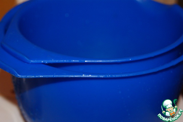 Накануне нужно приготовить ледяную тарелку. Для этого нам понадобятся 2 емкости разного размера и объема. В большую емкость налить немного воды, приблизительно на 2 пальца, и поместить в нее меньшую, сверху поместить небольшой груз. Поставить емкости на ночь в холодильник и дать полностью застыть. Чтобы освободить ледяную тарелку от емкостей, необходимо в меньшую налить теплую воду, меньшая по объему емкость легко выйдет. Затем поместить большую емкость в чуть теплую воду, и она тоже легко отпустит нашу ледяную чашу.