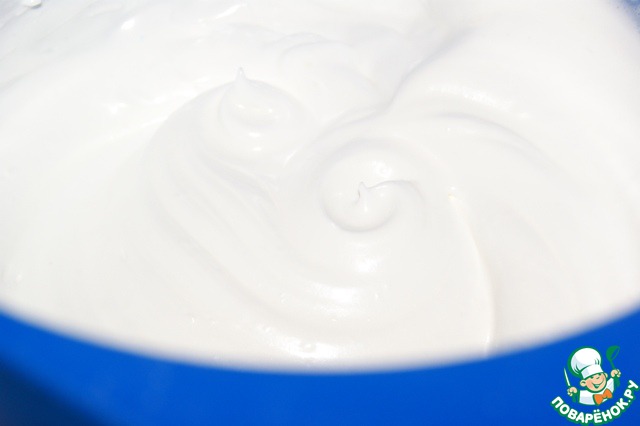 Белки взбить в пену и, не переставая взбивать, ввести пудру. Меренга должна получиться гладкая и блестящая.