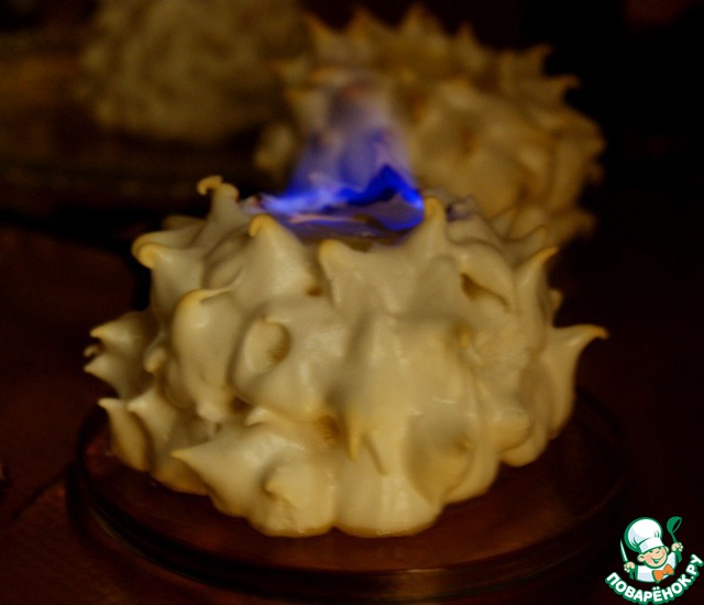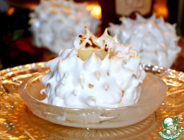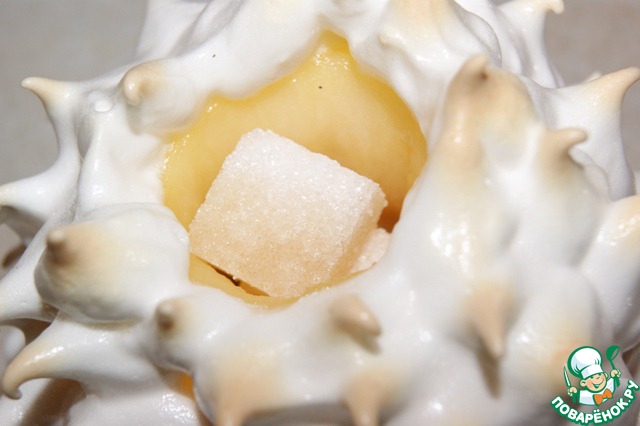 Поместить противень в прогретую до 160"С духовку и запечь яблоки, чтобы меренга слегка стала тверже и прихватилась 7-10 минут. Ориентируйтесь на вашу духовку! Поместить яблоко на ледяную тарелку, непосредственно перед подачей, а внутрь каждого яблока поместить 2-3 кусочка сахара и полить его сверху коньяком.