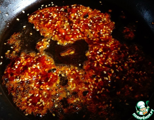 В оставшемся масле распустить сахар до карамельного состояния (так, чтобы цвет поменялся на приятный карамельный) всыпать в него кунжут.