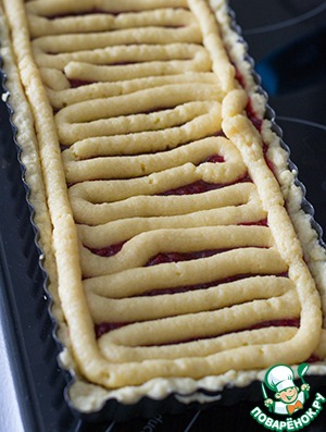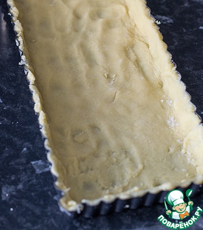 Смазать форму маслом. Тонко раскатать тесто (примерно 5 мм толщиной) и выложить в форму, формируя бортики.