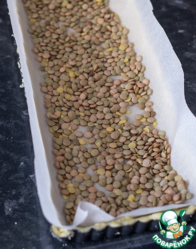 На тесто выложить бумагу для выпечки. Насыпать груз (у меня чечевица) и выпекать около 15 минут.