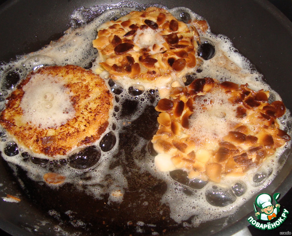 Нагреваем растительное масло в глубокой сковороде .Выкладываем кольца и обжариваем буквально по минуте на среднем огне.Дольше не надо следите что бы орех не подгорел.