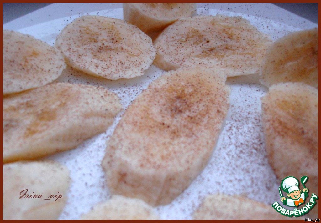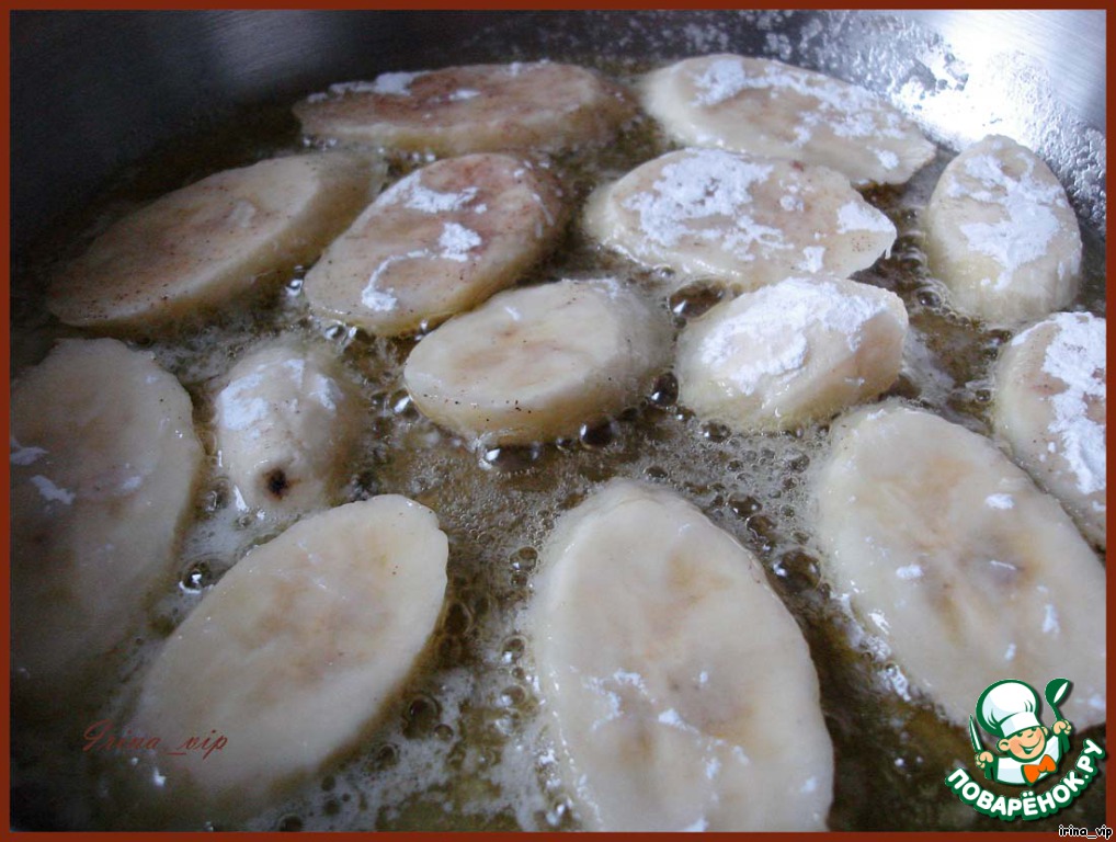 смешать крахмал и сахарную пудру, запанировать в этой смеси банановые кружочки