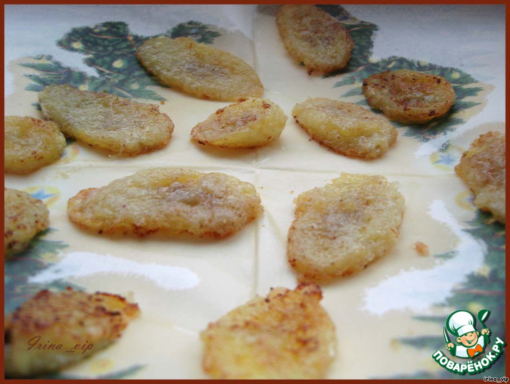 Обжаренные бананы выложить на блюдо, застеленное салфеткой, с тем, чтобы избавиться от излишков масла.