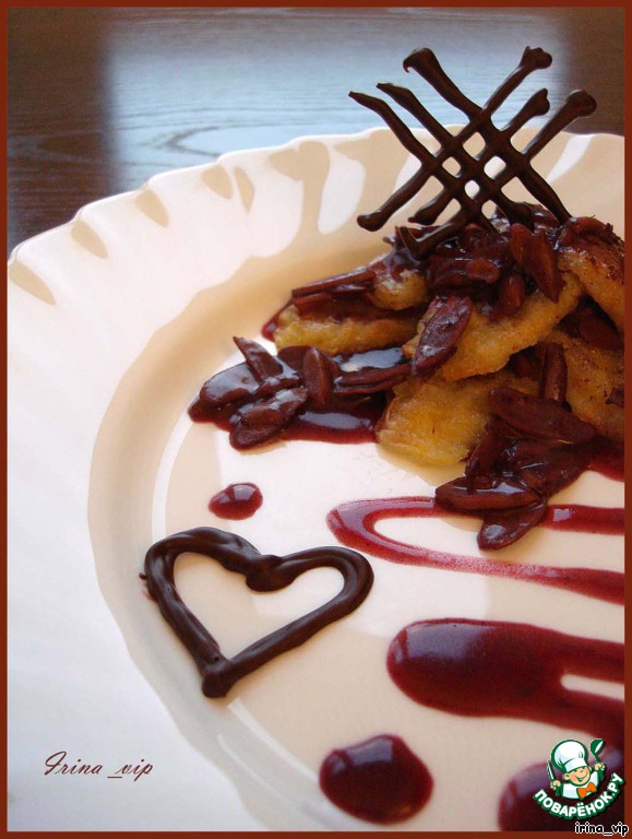 Я отцедила немного винного соуса, полила им тарелку, в беспорядке выложила обжаренные бананы (снимать их с салфетки рекомендую осторожно, дабы не повредить крахмальную корочку, которая местами прилипает, но хорошо отходит, если не дёргать резко). Поверх бананов выложила тушёные в вине орехи и полила соусом, украсила шоколадными фигурками, которые ждали своего часа в холодильнике.