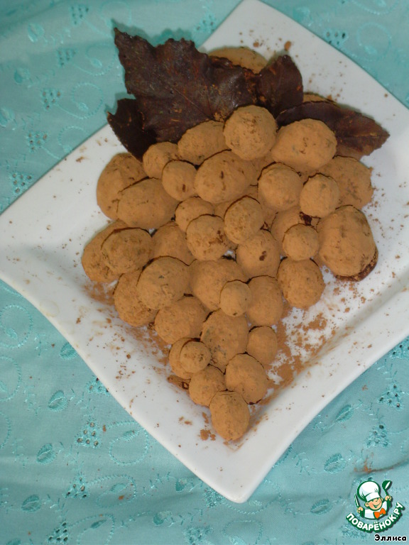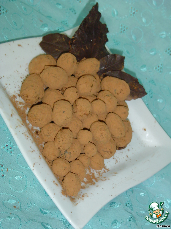 Из трюфельных шариков разного размера выложите на тарелке гроздь винограда и украсьте шоколадными листиками.