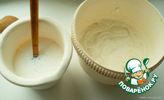 Сливки взбить венчиком, добавить к творожной массе, тщательно перемешать.
