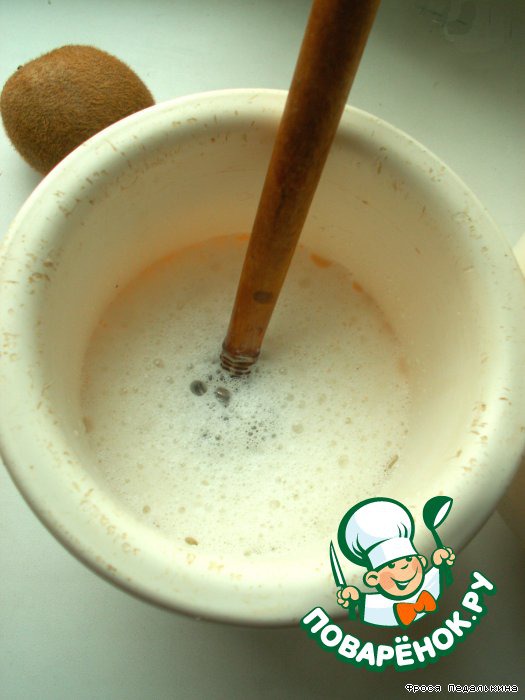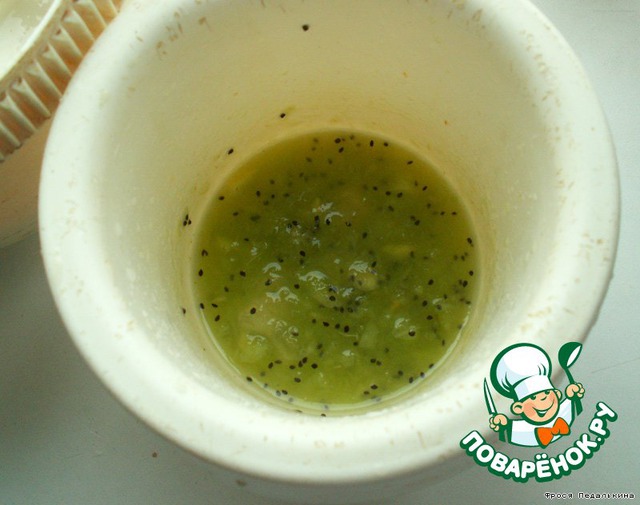 Киви очистить от кожуры, несколько ломтиков оставить для украшения, остальное измельчить блендером, добавить 0,5 ст.л. сахара, размешать.