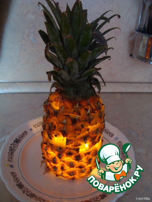 Сложить все кольца в виде ананаса и в середину поставить плавающую свечу. Сверху прикрыть ананасовым хвостиком. Ананас лучше брать покрупнее, чтобы пламя свечи не доставало хвостика. Ананасовую мякоть разрезать на порционные кусочки и разложить вокруг самого светящегося ананаса. Можете добавить и другие фрукты.