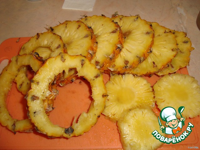 Ананас порезать кольцами и вырезать серцевину из кожуры.
