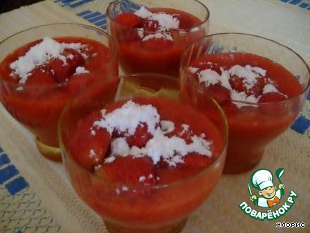 Все просто: клубнику промываем, чистим откладываем для украшения несколько крупных ягод. Остальную вместе с сахаром взбиваем блендером, довольно долго - нам надо получить практически однородную массу. В два захода по 2 минуты - оптимально. Разливаем ароматную массу по бокалам или креманкам и ставим в морозилку на 20 минут. Перед подачей посыпаем сахарной пудрой. Как мягкое мороженое!!! В жару - прелесть!!!