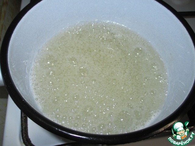 Поставила вариться сироп: высыпала в кастрюльку весь сахар, долила 70 мл кипятка, и мешала, пока сахар не распустился весь. Сняла пену, сделала небольшой огонь, и занялась остальным: