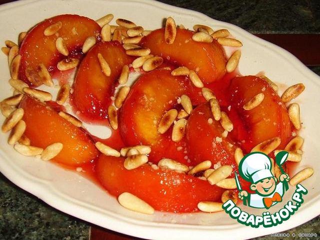 Достаём из холодильника остывшие персики, посыпаем их обжаренными орешками и, если хотите, миндальной крошкой (никакого вкуса она не добавит, просто для украшения).