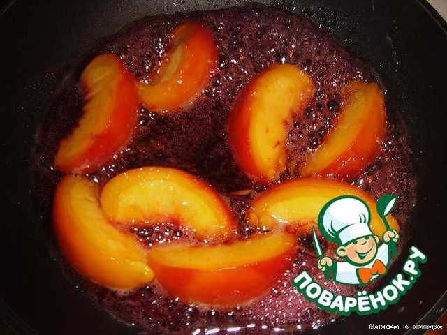 Выкладываем туда дольки персика и глазируем минут 5 на среднем огне (чтобы сахар не подгорал).