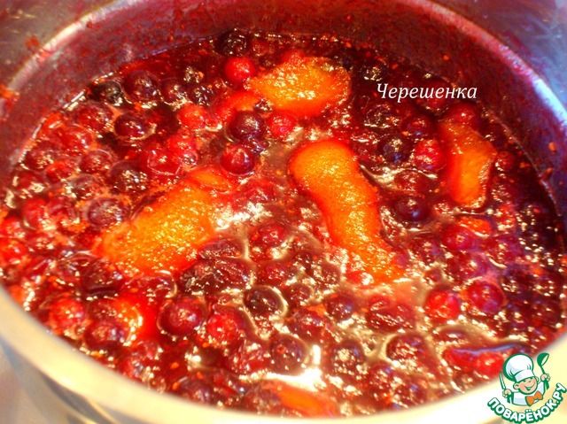 Дно формочек для запекания (несколько маленьких или одну большую) смазать сливочным маслом. Смазываем только дно, т. к. масло на стенках не даст потом суфле подняться и оно соскользнет вниз, "опадет". Смешать в маленькой кастрюльке или сковороде клюкву, сок и цедру апельсина, 75г сахара. Перемешать.