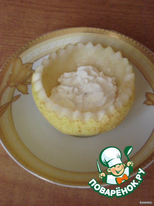 На дно чашечки из груши выкладываем взбитые с сахаром сливки.