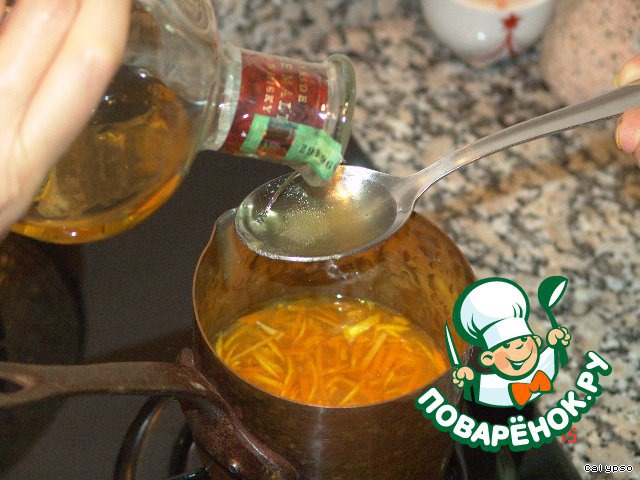 Из сока и цедры 2-х апельсинов, 1 стол. ложки виски и 2 столовых ложек сахара варим сироп, пока он немного загустеет.