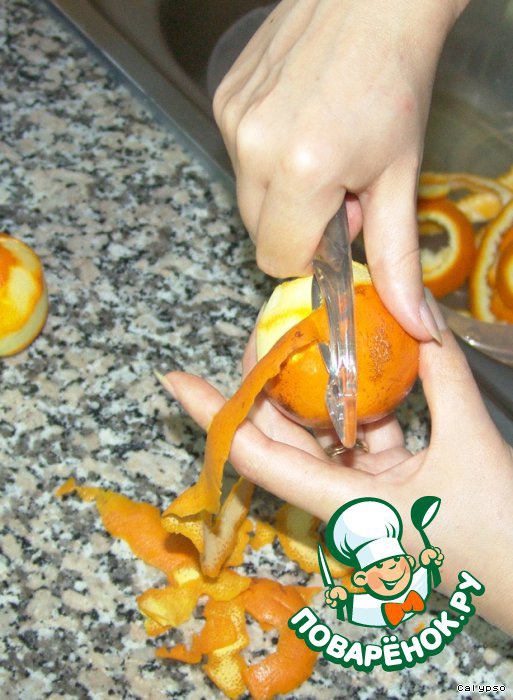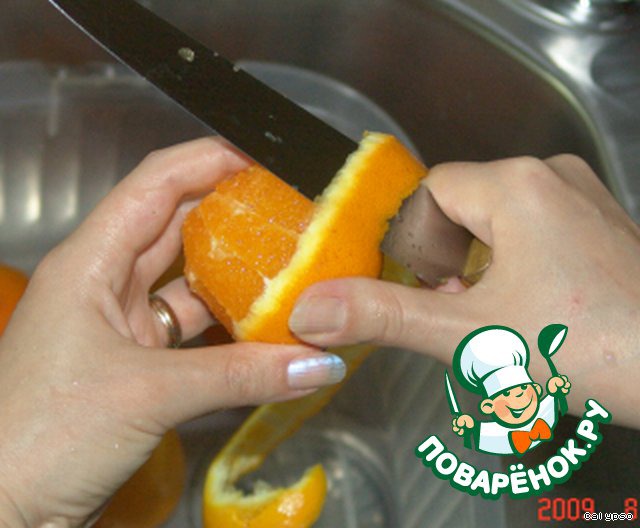 Очень тонким остро отточеным ножом снимаем цедру с 2 апельсинов.