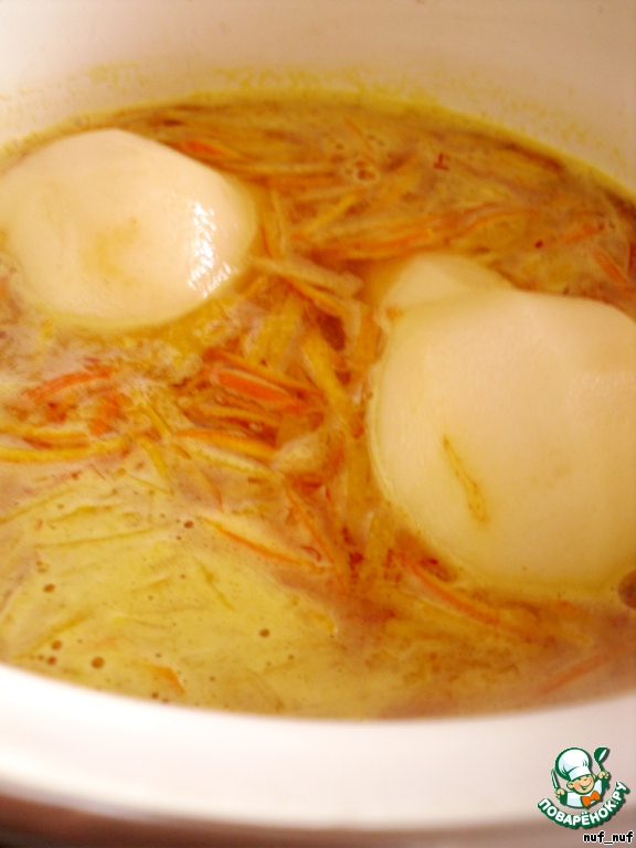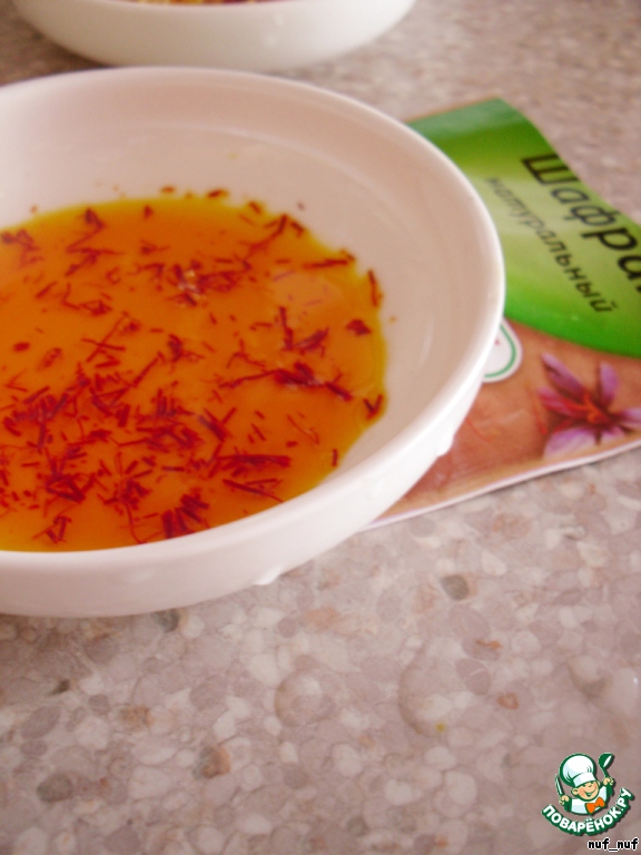 Залить нити шафрана (одна стандартная упаковка 0,12 гр) столовой ложкой горячей воды и оставить на 5-7 минут.