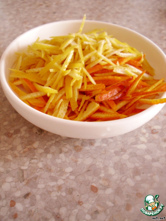 С апельсина и лимона овощечисткой снять цедру полосками и затем нарезать их тонкой соломкой.