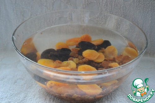 Курагу, изюм и чернослив замочить в воде на пару часов.