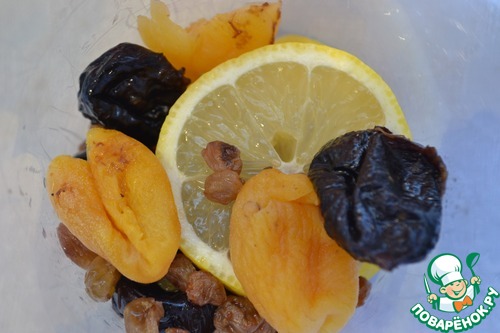 Лимон хорошенько помыть, удалить семечки. С сухофруктов слить воду и измельчить все используемые ингредиенты в блендере, не очищая лимон от кожуры.