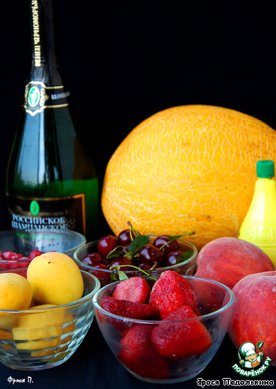 Оригинал рецепта (текст немного адаптирован). У хорошей дыни срезать часть у стебля, из другой части вынуть семечки и всю сеткообразную и мясистую внутренность, не касаясь кожи. Получится своего рода кубок или ваза. Дыню ставять на блюдо, покрытое сложенною вчетверо салфеткою и убранное вокруг дыни самыми разнообразными цветами садовыми или оранжерейными. Затем берут пару спелых персиков, 4 абрикоса, 1/2 фунта клубники, 1/4 фунта малины, несколько ломтей той же дыни без семечек и 30 вишен. Фрукты и ягоды очищают от косточек, режут, смешивают в серебряной кастрюле и ставят на лед. Фунт сахара истолочь в среднюю степень мелкости, т.е. не слишком мелко, а скорее крупно, сложить в большую чашку, налить в сахар стакан воды, чтобы он скорее растаял, вскипятить и остудить. Потом влить в чашку (!) бутылку шампанского прямо со льда, осьмушку распущенного желатина и сок из 4-х лимонов, пропущенный через сито, помешивая все это серебряной ложкой. Когда все подготовлено, уложить фрукты в дынную вазу, залить желе из шампанского и подавать.