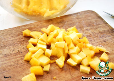 На персике сделать разрез крест-накрест, ошпарить кипятком и снять кожицу, вынуть косточку, мелко нарезать кубиками.