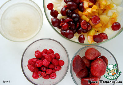 Из вишни удалить косточку (специальный девайс для этого я благополучно забыла на даче), разрезать пополам. Клубнику тоже порезать, оставив пару ягод для украшения. Подготовленные фрукты убрать в холодильник.