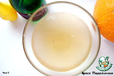 По рецепту, когда сироп остыл, добавить распущенный желатин, сок 4 лимонов и бутылку шампанского. Многовато для такой дыни, а может раньше бутылки меньше были? Я заменила лимоны на 2 ст.л. лимонного сока. Шампанского получилось примерно 1,5 стакана. Мешала серебряной ложечкой!