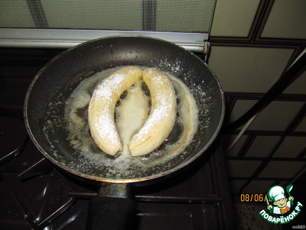 Бананы очистить и положить в сковороду, насыпать сверху половину сахарной пудры и жарить до золотистого цвета. Перевернуть, посыпать оставшейся пудрой и поджарить с другой стороны.