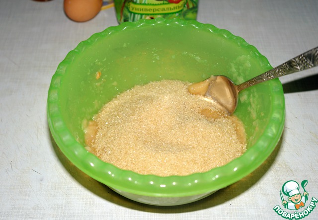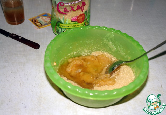 К пюре добавить сахар. Здесь важен именно коричневый сахар, так как он придает готовому десерту карамельный привкус.
