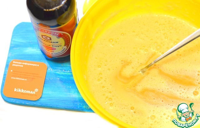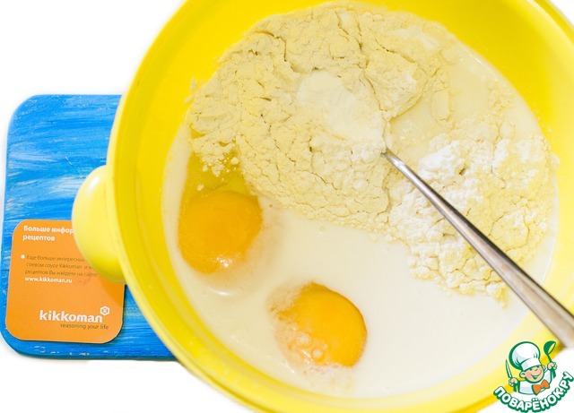 Взбить миксером яйца с сахаром, добавить молоко, ванильный сахар, муку и разрыхлитель, ещё раз взбить.