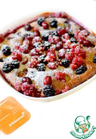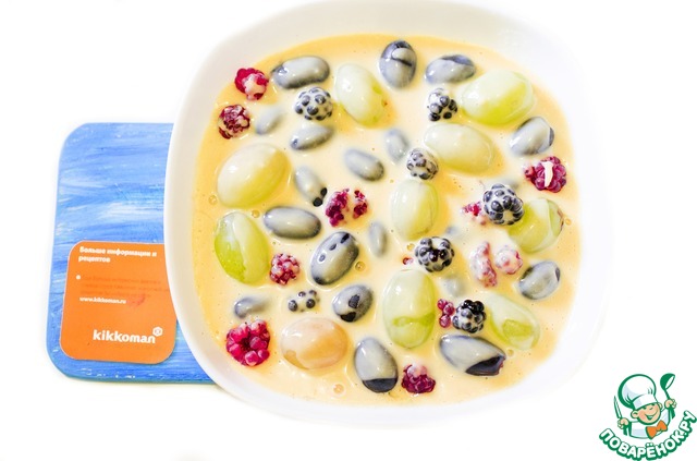 Вылить 1/4 часть теста в каждую тарлку с ягодами. Поставить на противне в духовку.