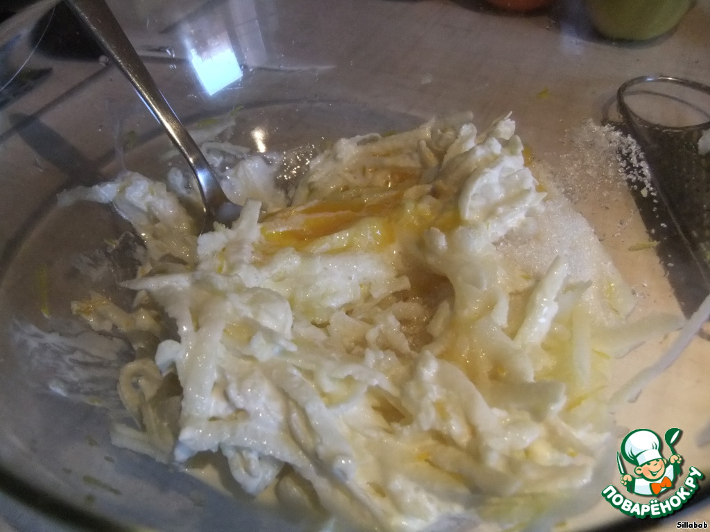 Делаем фарш. Для этого чистим 2 яблока, трем на крупной терке, добавляем сок и цедру половины лимона, желток, сливки и сахар. Перемешиваем, отставляем в сторону.