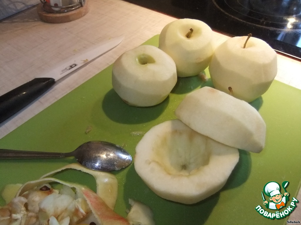 Теперь готовим яблоки-формочки. Яблоки чистим, режем пополам и вынимаем ложкой сердцевину у обоих половинок. Теперь есть два варианта. Первый - налить в противень немного воды и запечь наши формочки почти до готовности, минут 30.